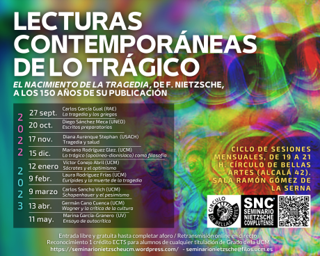 Con motivo del 150 aniversario de la publicación de El nacimiento de la tragedia, el Seminario Nietzsche Complutense y el Círculo de Bellas Artes organizan un ciclo de conferencias mensuales, de septiembre de 2022 a mayo de 2023 en el que, bajo el título «Lecturas contemporáneas de lo trágico. El nacimiento de la tragedia, de F. Nietzsche, a los 150 años de su publicación«, se desgranarán las nociones fundamentales de esta decisiva obra de F. Nietzsche.