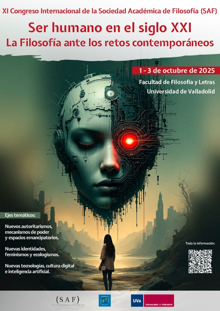 Si bien todo análisis resulta restrictivo respecto a la gran diversidad que presentan los retos contemporáneos para situarnos y pensar nuestras actualidades, posibilidades y limitaciones de ser humanos en el siglo XXI, estos tres ejes temáticos pretenden servir al menos de coordenadas para la tarea a la que el XI Congreso de la SAF nos reúne del 1 al 3 de octubre de 2025 en Valladolid. Además, este Congreso está abierto, más allá de su tema específico y a través de las diferencias líneas temáticas de comunicaciones, a propuestas que estén vinculadas, en general, al área de Filosofía.